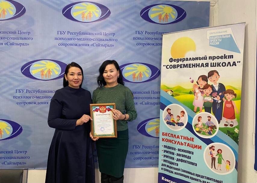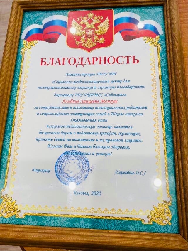 Сегодня директору Республиканского центра «Сайзырал» при Министерстве образования Республики Тыва Альбине Монгуш была вручена Благодарственное письмо от администрации ГБОУ РТ «Социально-реабилитационный центр для несовершеннолетних», в лице заведующей отделением школы опекунов Натальи Ондар за сотрудничество в подготовке потенциальных родителей и сопровождению замещающих семей в Школе опекунов.