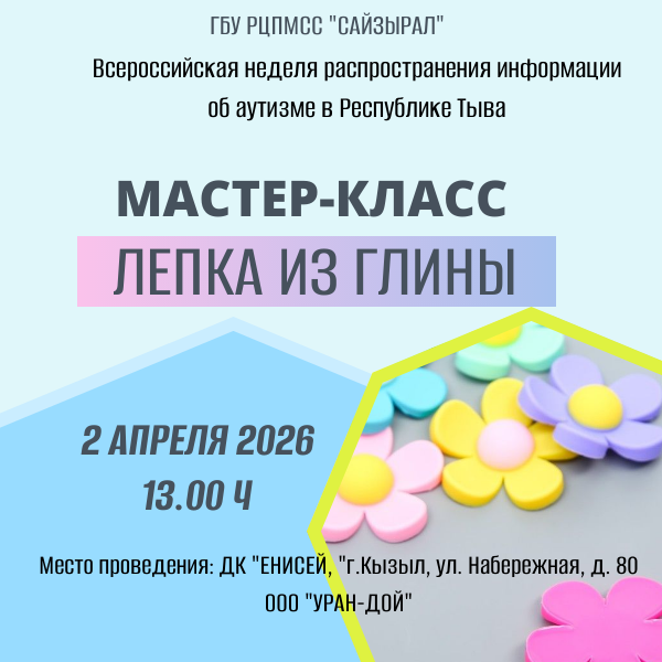 Также 2 и 3 апреля на базе центра Сайзырал участники регионального этапа конкурса профессионального мастерства «Лучший учитель-дефектолог Республики Тыва-2024» показали мастер классы по работе с детьми с ограниченными возможностями здоровья, в том числе с детьми с РАС. https://vk.com/sayzyral17?w=wall-215998805_1251, https://vk.com/sayzyral17?w=wall-215998805_1261